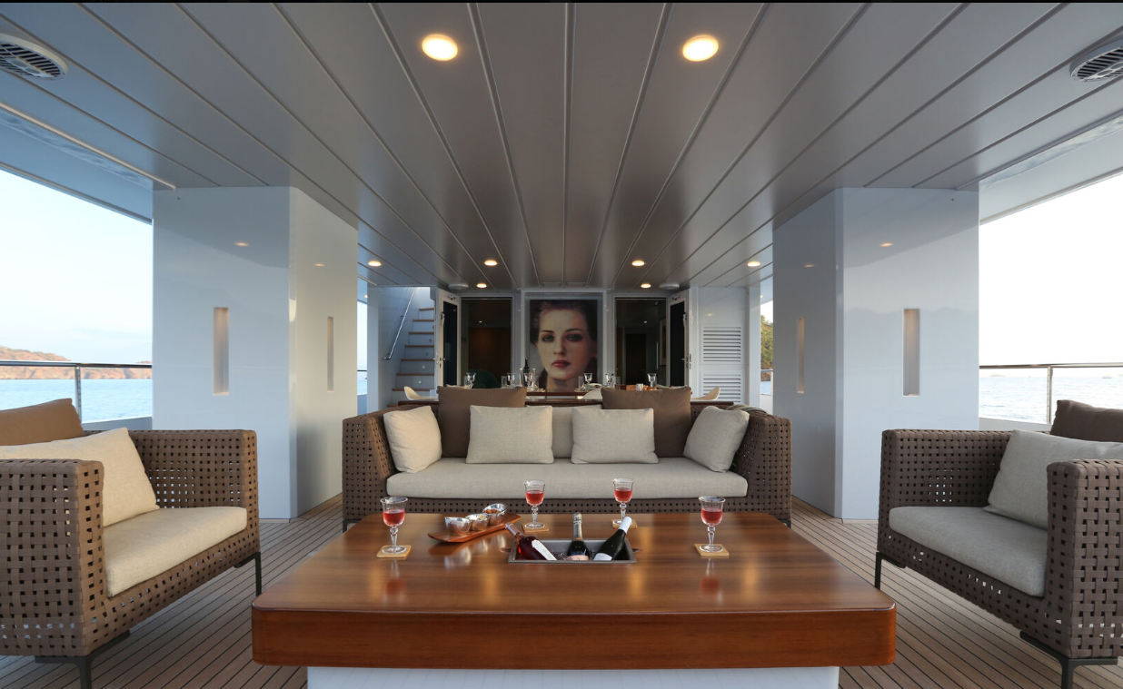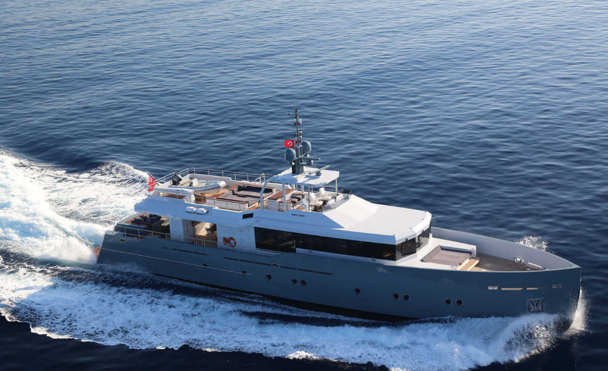 Exterior design by Tansu Yachts emphasizes simplicity and proportion. Throughout the yacht, generous lounge areas on the main deck and flybridge offer panoramic views, while outdoor spaces include a deck jacuzzi for relaxation. Furthermore, an advanced stabilization system reduces roll at anchor or underway, enhancing onboard comfort.